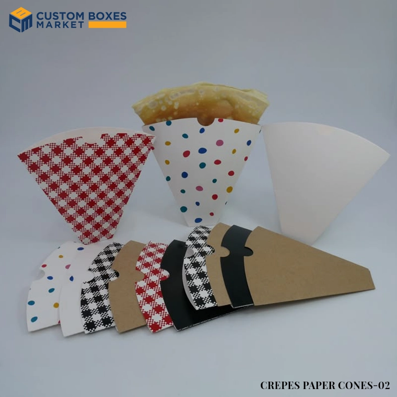 CustomBoxesMarket provides personalized paper cones for holding or presenting crepes. More than just a holding stand, these paper cones are the heart of your packaging and an extension of your brand, which is everything for businesses that want to stand out from the competition.