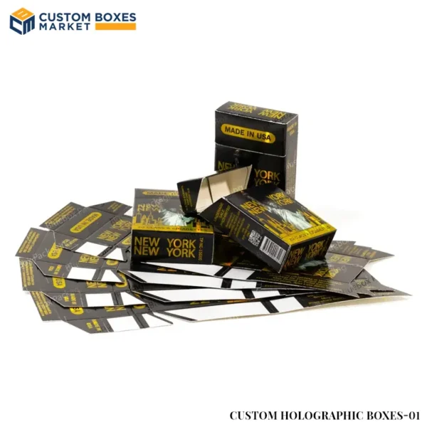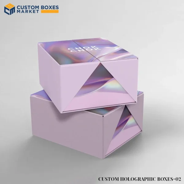 The name holographic boxes itself gave an idea about their appearance. But, what makes them unique is their distinct packaging. Traditional packaging methods do not exist anymore. The industry has progressed greatly. For the Holographic boxes, well-presented packaging is necessary because ordinary packaging boxes are not enough to elevate the brand sales and grab customers' attention. To serve this purpose, Custom Boxes Market provides high-quality custom holographic boxes. With our advanced techniques, you can surely build a trustworthy brand image. We provide sturdy materials that are eco-friendly and biodegradable and keep your products secure during shipping and storage processes. Besides material, we also offer our customers full-color printings, finishes, and enticing decorative elements to add a personalized touch to the packaging boxes. Not only this, you can make your company a well-recognized one in the marketplaces with our customization facilities of embossing/debossing/stamp foiling your logo, brand information, and color palettes. This way your sales can hike up drastically. So, without wasting any time, order your customized holographic packaging boxes and take your brand to the new skies.